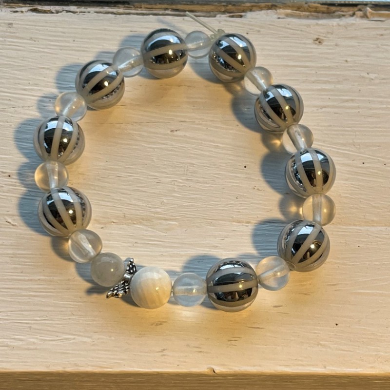 Armbånd med glasperler og engel. Måler ca 18 cm i omkreds.