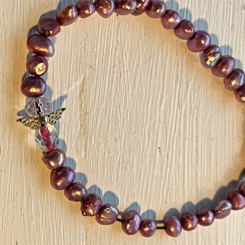 Smukt lille armbånd med ferskvandsperler perler. Der sidder en lille engel i armbåndet. Armbåndet måler ca 20 cm.