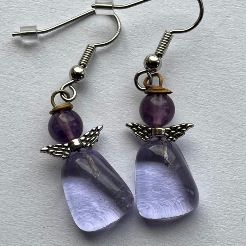 Smukke glasøreringe med ametyst. Englene måler ca 2,5 cm. Ørekrogene er kirurgisk stål og dermed nikkelfrie.